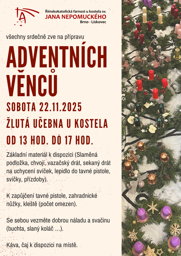 Příprava adventních věnců sobota 22. listopadu 2025 13.00 – 17.00 hodin žlutá učebna za kostelem sv. Jana Nepomuckého, Brno – Starý Lískovec