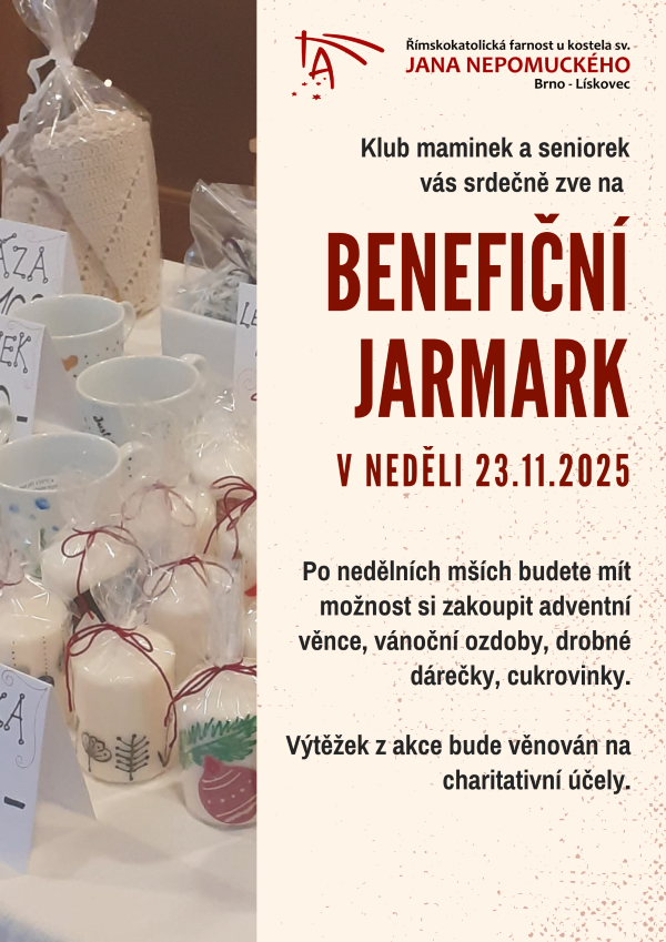 Benefiční jarmark sobota 23. listopadu 2025 po nedělních mších svatých kostel sv. Jana Nepomuckého, Brno – Starý Lískovec