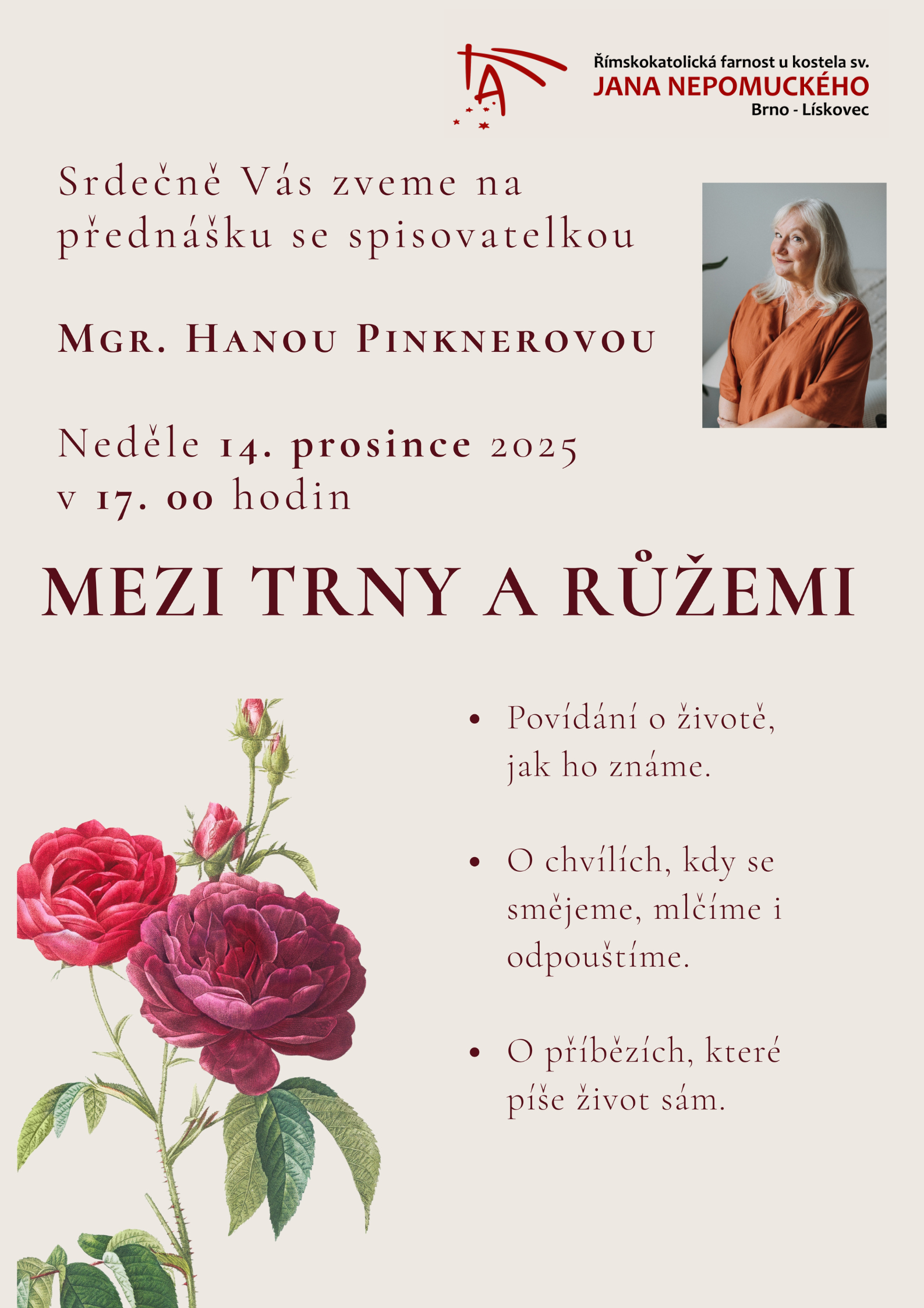 Spisovatelka Mgr. Hana Pinknerová přijede k nám do farnosti povídat o životě, jak ho známe, o chvílích, kdy se smějeme, mlčíme i dopouštíme, o příbězích, které píše život sám.