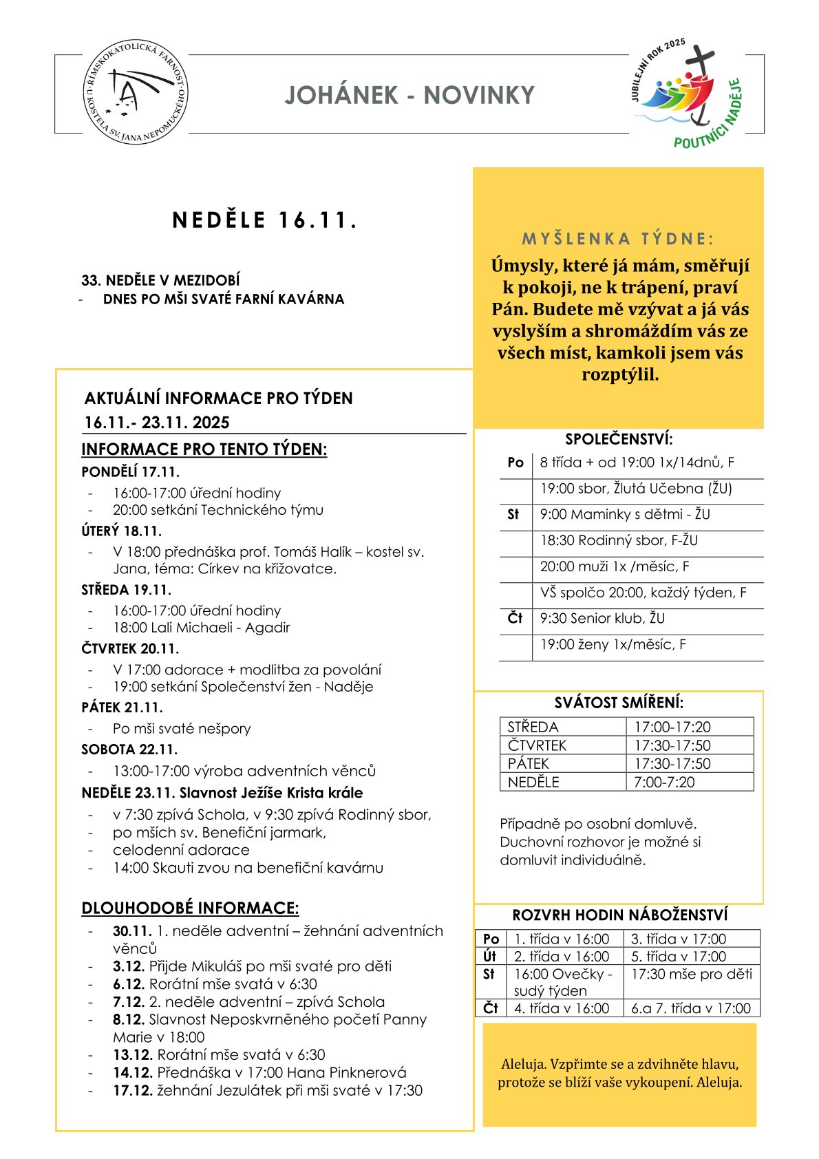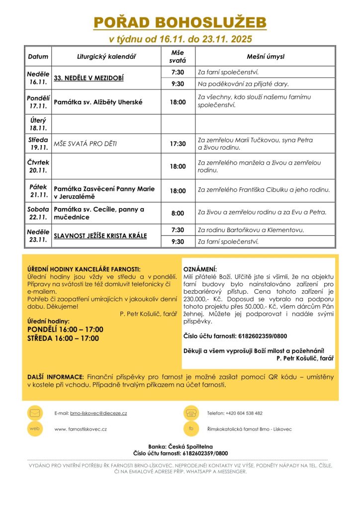 pondělí 18.00 hod. (kromě prázdnin) středa 17.30 hod. (během školního roku pro děti) čtvrtek 18.00 hod. pátek 18.00 hod. sobota 8.00 hod. (kromě 1. soboty v měsíci) neděle 7.30 hod., 9.30 hod.